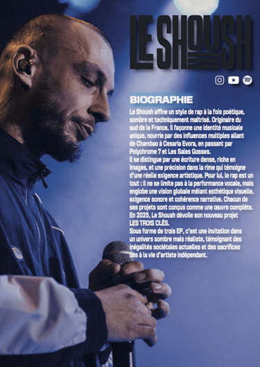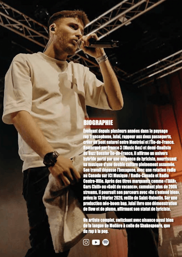 Biographie, storytelling, présentation artistique, visuels, liens d’écoute : chaque élément est structuré pour faciliter la compréhension rapide de votre univers par les médias et professionnels.