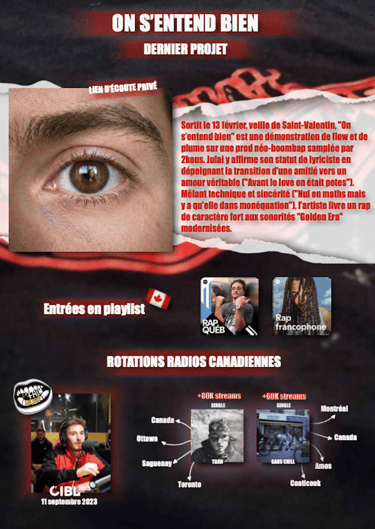 Définition des angles éditoriaux en lien avec l'identité musicale, ciblage des médias pertinents (rap, musiques actuelles, culture, médias locaux ou nationaux), prises de contact, relances et suivis.